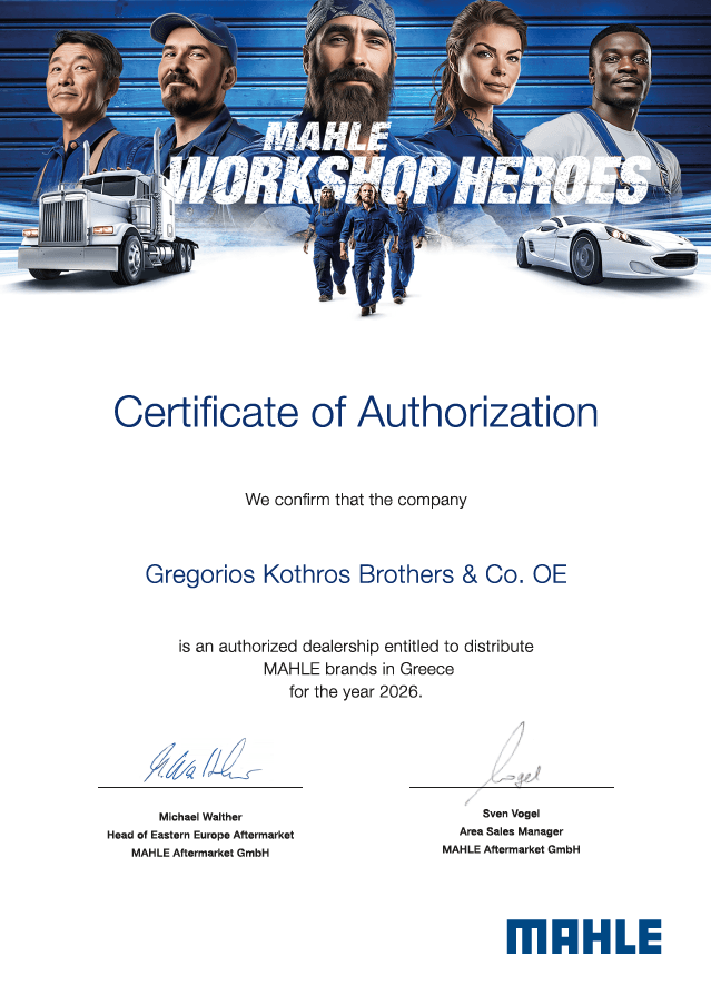 Οι Πιστοποιήσεις που κατέχει η εταιρεία Αφοί Γρηγορίου Κόθρου & ΣΙΑ Ο.Ε. δεν είναι απλώς έγγραφα, αλλά η εγγύηση της κορυφαίας ποιότητας που προσφέρουμε στους πελάτες μας εδώ και δεκαετίες. Ως Authorized Distributor για την Ελλάδα, διασφαλίζουμε ότι κάθε ανταλλακτικό που φτάνει στα χέρια σας –από έναν δίσκο συμπλέκτη ZF Sachs έως τα συστήματα μετάδοσης της Schaeffler (LuK & INA)– συνοδεύεται από την επίσημη σφραγίδα εργοστασιακής γνησιότητας. Η εμπιστοσύνη των μεγαλύτερων κατασκευαστών παγκοσμίως, όπως η Mahle και η Miba, αποτελεί το θεμέλιο της συνεργασίας μας με επαγγελματίες που δεν συμβιβάζονται με τίποτα λιγότερο από το άριστο.